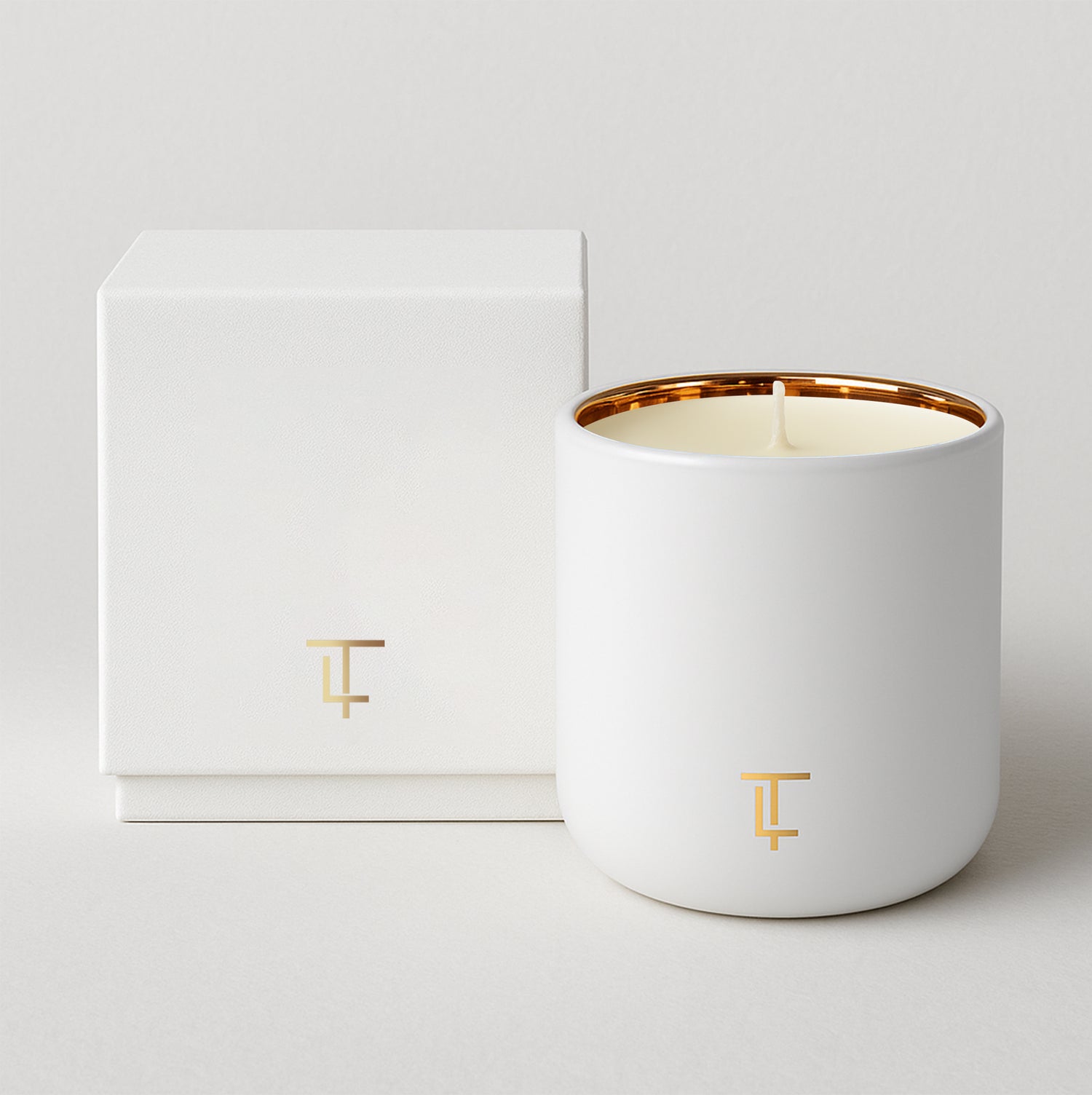 This ~180g single wick candle is housed in a sleek white matte glass vessel, accented with a refined gold insert that catches the light beautifully. The design is completed with subtle "Timeless" lettering, offering a minimalist yet luxurious aesthetic. Paired with a matching white box adorned with the signature gold "TL" logo, it’s a perfect gift or indulgent treat for the festive season.